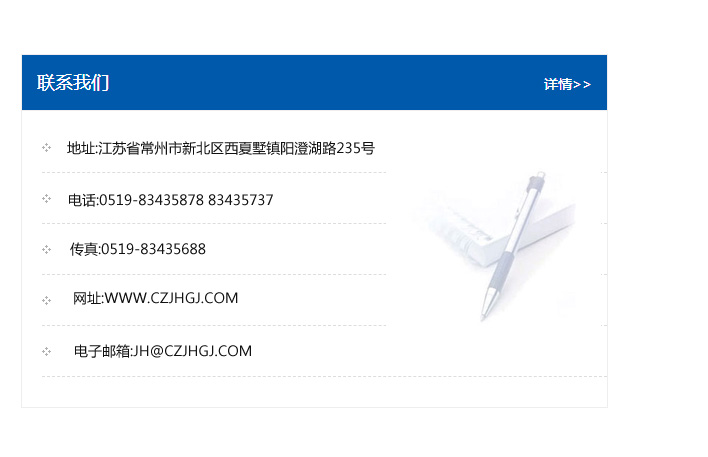 地址:常州市新北區友邦商務大廈1幢16、17層  電話:0519-85101652  傳真:0519-85112595  郵編:213022  網址:www_cz-jiayue_cn.revolutionsliders.com  郵箱:xiajifengaa@163.com